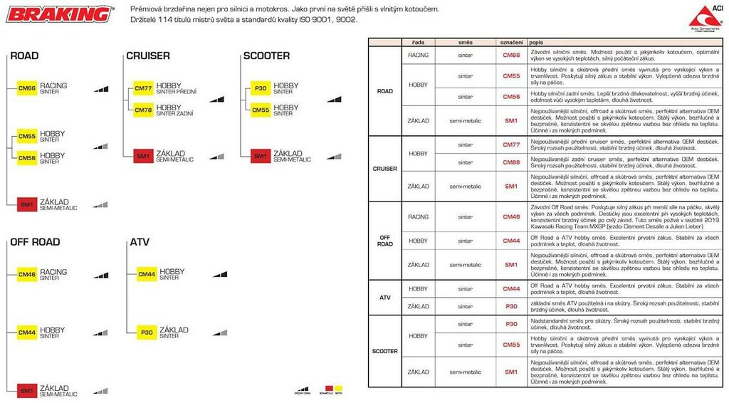 BRAKING: Prémiová brzdařina nejen pro silnici a motokros. Jako první na světě přišli s vlnitým kotoučem. Držitelé 114 titulů mistrů světa a standardů kvality ISO 9001, 9002. Destičky směs SM1: - nejpoužívanější silniční, offroad a skútrová směs, perfektní alternativa OEM destiček - stálý výkon - nehlučné a bezprašné - vhodné k použití s jakýmkoliv kotoučem - bezproblémové se skvělou zpětnou vazbou bez ohledu na teplotu - výjimečně účinné i za mokra