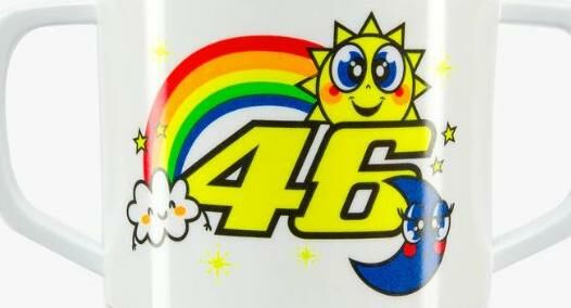 - Dětský hrnek z kolekce VR46 Classic 2022 od Valentina Rossiho z melaminu představující Valeovo číslo 46 a pěknou karikaturu Slunce a Měsíce.