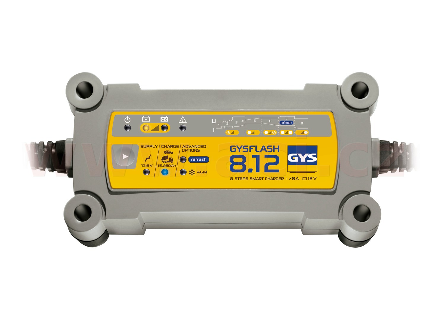 GYSFLASH 8.12 je speciálně navržen tak, aby nabíjel všechny typy 12V baterií v osobních automobilech, užitková vozidlech nebo nákladních automobilech. Nabízí 8-krokovou inteligentní křívku a režim «Supply» (napájení), pro napájení vozidla v showroomech.
