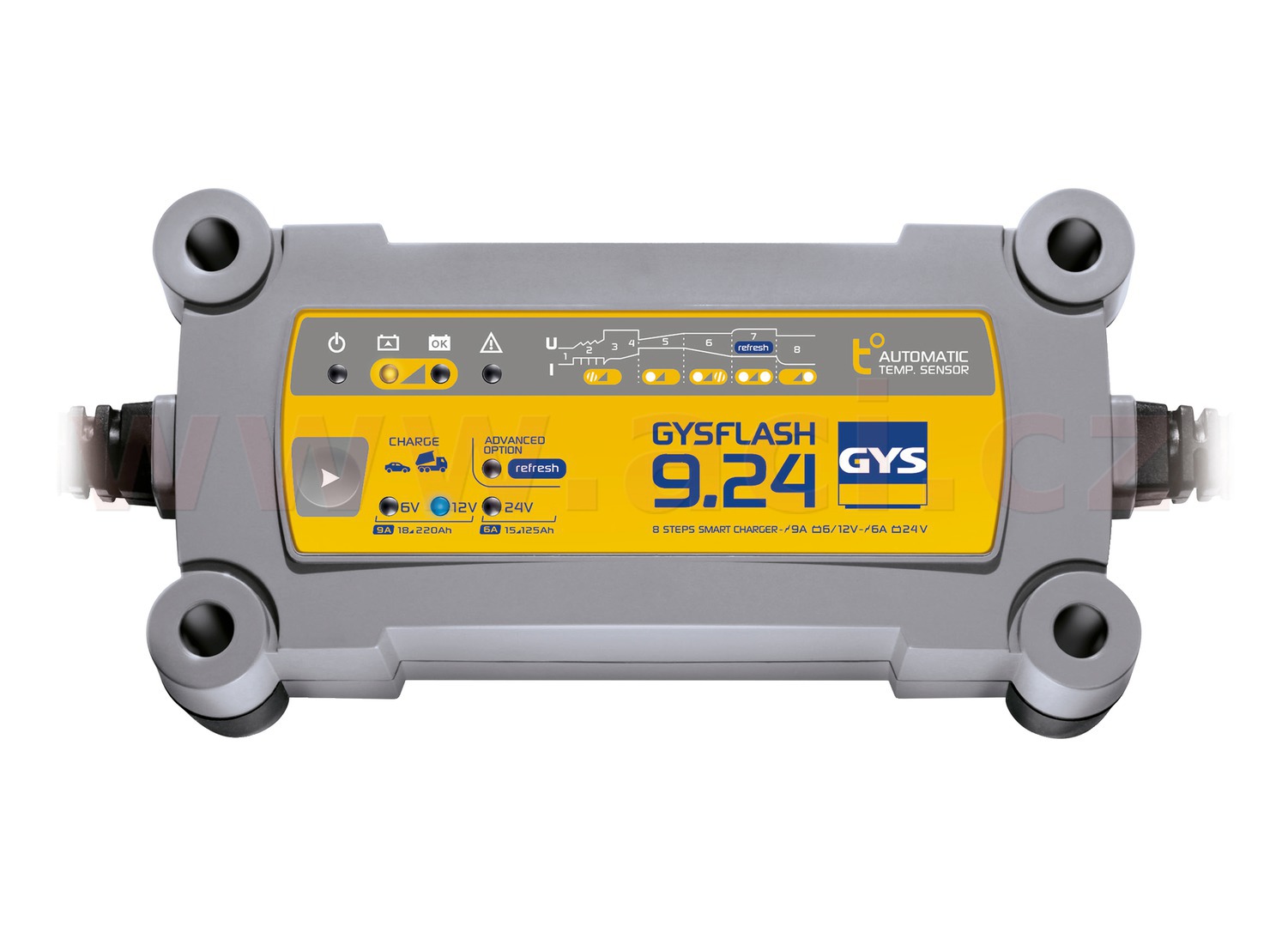 GYSFLASH 9.24 je speciálně navržena tak, aby nabíjela všechny typy baterií 6, 12 a 24 V pro všechny typy vozidel. Nabízí 8-krokovou inteligentní křívku pro optimální nabíjení a režim "Refresh" pro hluboce vybité baterie.