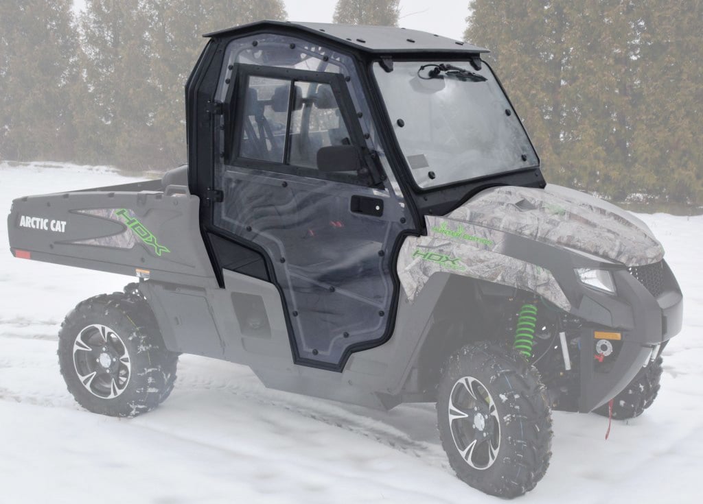 Vyhřívaná kabina pro Arctic Cat Prowler HDX 700i HDX (2016), přední okno z bezpečnostního skla se stěračem a ostřikovačem, uzamykatelné 180° otevíratelné dveře z bezpečnostního skla (posuvná okna) a čirého tvrzeného polykarbonátu, zadní panel z čirého tvrzeného UV odolného polykarbonátu, teplovodní topení