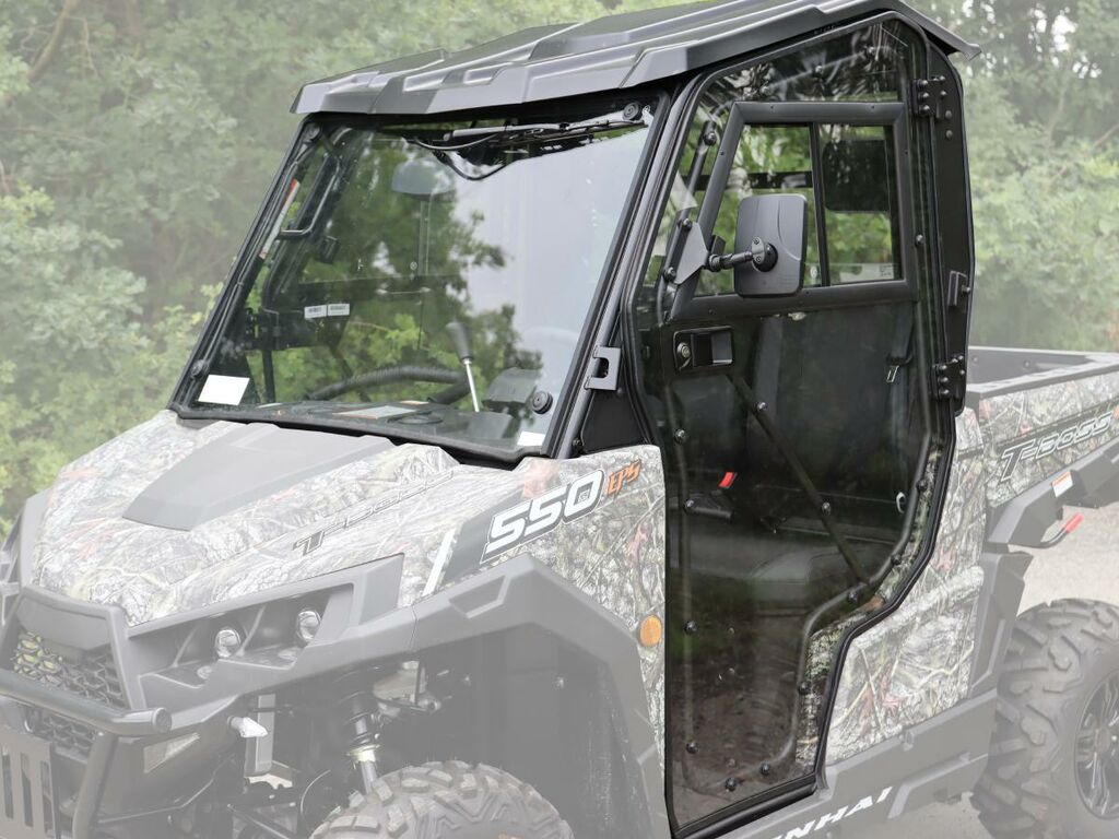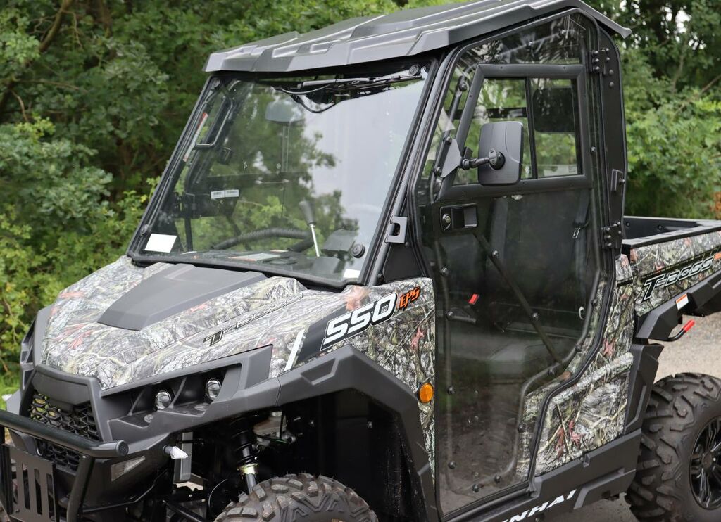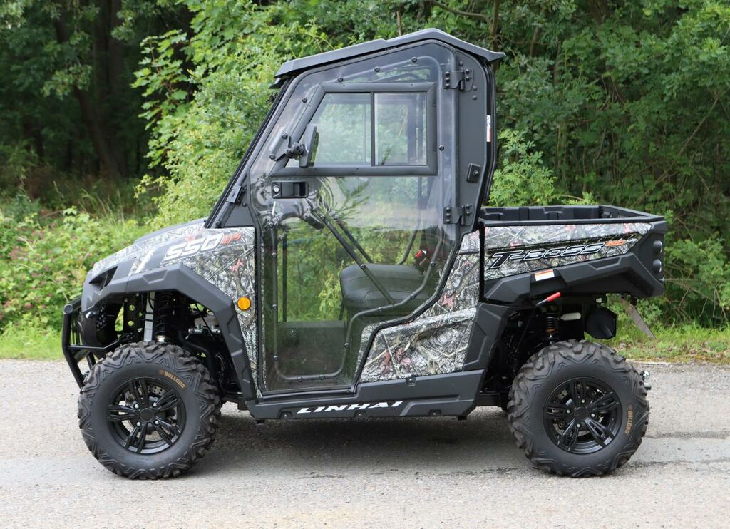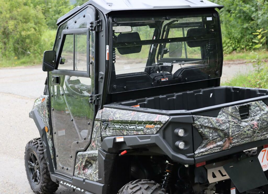 Vyhřívaná kabina pro UTV Linhai 520/550/570/650 T-BOSS, bez střechy (lze použít originální dodávanou střechu), čiré polykarbonátové dveře, uzamykatelné s posuvnými okny, přední okno z bezpečnostního skla se stěračem a ostřikovačem, zadní čelo z čirého tvrzeného UV-odolného polykarbonátu, teplovodní topení