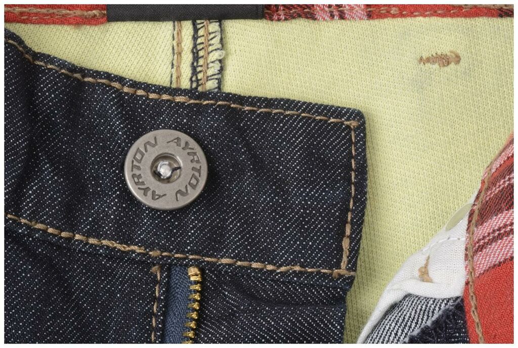 vnější vrstva ze 100% 12-ti uncového denimu podšívka z Kevlar® Dupont™ tkaniny výškově nastavitelná poloha vnitřních kolenních protektorů kostkované vzorování v oblasti vnitřní výstelky pasu