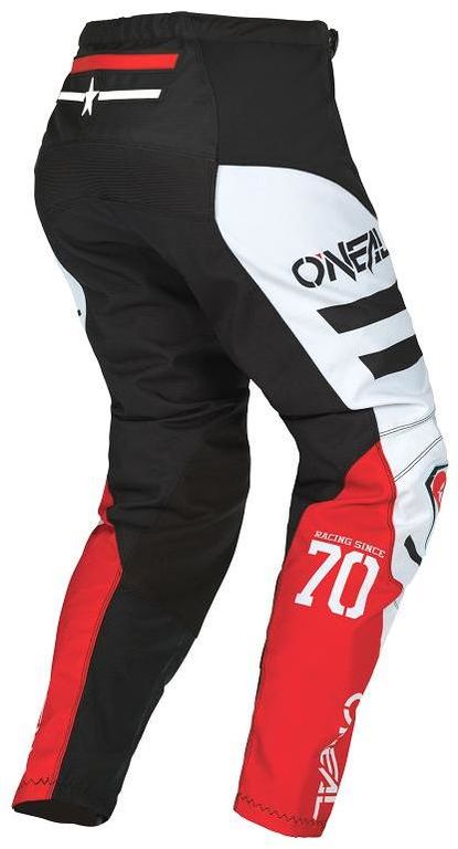 Kalhoty pro MX a MTB, vyrobené z velmi pevného, ale lehkého materiálu. Sedací část, vnitřní strany nohavic a kolena jsou vyrobeny z odolnějšího materiálu. Kolena, rozkrok a zadní část mají pružné, střečové panely a kompletní síťovanou podšívku pro větší pohodlí. Kalhoty mají elastický pas se zapínáním na plastovou přezku pro přizpůsobení velikosti. Ochranu dále zajišťují vyjímatelné pěnové chrániče boků.