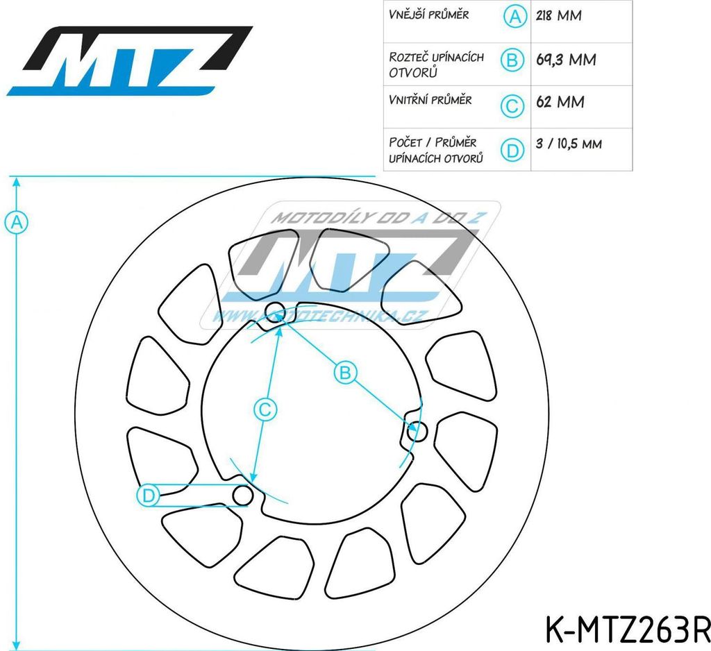 Brzdové kotouče MTZ jsou vyrobeny ze speciální ušlechtilé nerezové oceli s excelentní kombinací vlastností (vysoká pevnost, odolnost proti teplotě, dlouhá životnost, nízká hmotnost) a jsou vyráběny pomocí moderních výrobních a technologických postupů.    Robustní konstrukce s dostatečným odlehčením rovnoměrně využívá   celou plochu   brzdových destiček   a   eliminuje deformaci vlivem   zahřát i při brzdění. Zajíždění: Nový brzdový kotouč (s novými brzdovými destičkami) je nutno správným způsobem zajet, aby byla zaručena dlouhá životnost a správný brzdný účinek (je potřeba min. 80% kontaktní plocha mezi destičkami a kotoučem). Během zajíždění je důležité se vyvarovat vysokým rychlostem, které vyžadují silné a prudké brzdění. Brzdový kotouč je nutno vyměnit, jakmile tloušťka kotouče klesne pod doporučený parametr (MIN.TH.) - viz. manuál výrobce motocyklu. Při výměně brzdového kotouče je doporučeno provést vždy výměnu brzdových destiček!