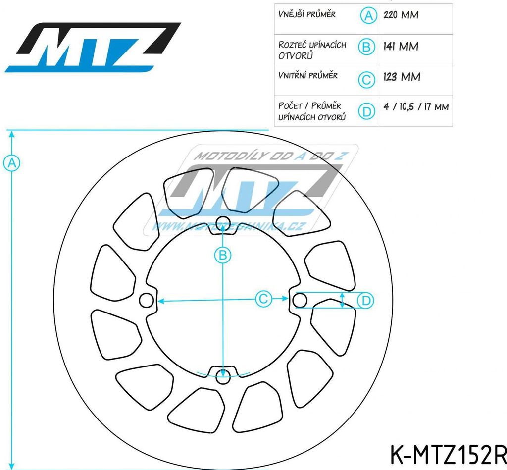 Brzdové kotouče MTZ jsou vyrobeny ze speciální ušlechtilé nerezové oceli s excelentní kombinací vlastností (vysoká pevnost, odolnost proti teplotě, dlouhá životnost, nízká hmotnost) a jsou vyráběny pomocí moderních výrobních a technologických postupů.    Robustní konstrukce s dostatečným odlehčením rovnoměrně využívá   celou plochu   brzdových destiček   a   eliminuje deformaci vlivem   zahřát i při brzdění. Zajíždění: Nový brzdový kotouč (s novými brzdovými destičkami) je nutno správným způsobem zajet, aby byla zaručena dlouhá životnost a správný brzdný účinek (je potřeba min. 80% kontaktní plocha mezi destičkami a kotoučem). Během zajíždění je důležité se vyvarovat vysokým rychlostem, které vyžadují silné a prudké brzdění. Brzdový kotouč je nutno vyměnit, jakmile tloušťka kotouče klesne pod doporučený parametr (MIN.TH.) - viz. manuál výrobce motocyklu. Při výměně brzdového kotouče je doporučeno provést vždy výměnu brzdových destiček!