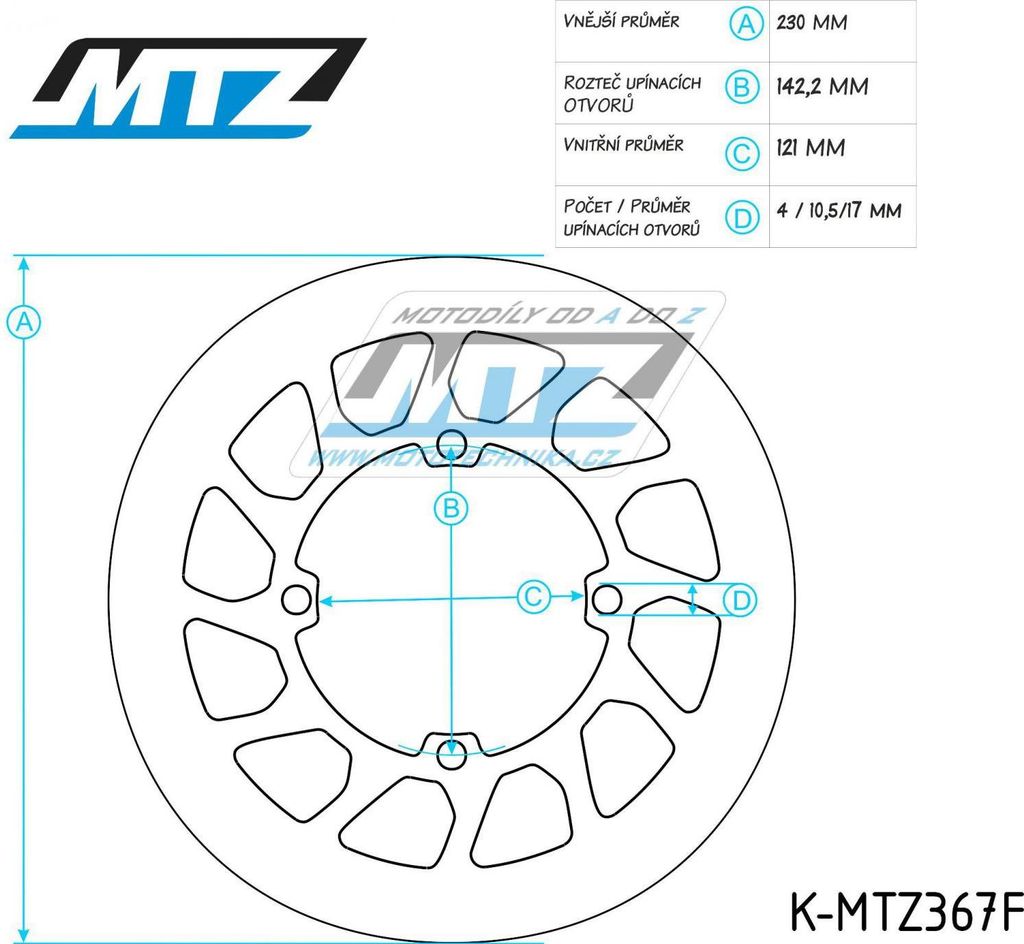 Brzdové kotouče MTZ jsou vyrobeny ze speciální ušlechtilé nerezové oceli s excelentní kombinací vlastností (vysoká pevnost, odolnost proti teplotě, dlouhá životnost, nízká hmotnost) a jsou vyráběny pomocí moderních výrobních a technologických postupů.    Robustní konstrukce s dostatečným odlehčením rovnoměrně využívá   celou plochu   brzdových destiček   a   eliminuje deformaci vlivem   zahřát i při brzdění. Zajíždění: Nový brzdový kotouč (s novými brzdovými destičkami) je nutno správným způsobem zajet, aby byla zaručena dlouhá životnost a správný brzdný účinek (je potřeba min. 80% kontaktní plocha mezi destičkami a kotoučem). Během zajíždění je důležité se vyvarovat vysokým rychlostem, které vyžadují silné a prudké brzdění. Brzdový kotouč je nutno vyměnit, jakmile tloušťka kotouče klesne pod doporučený parametr (MIN.TH.) - viz. manuál výrobce motocyklu. Při výměně brzdového kotouče je doporučeno provést vždy výměnu brzdových destiček!