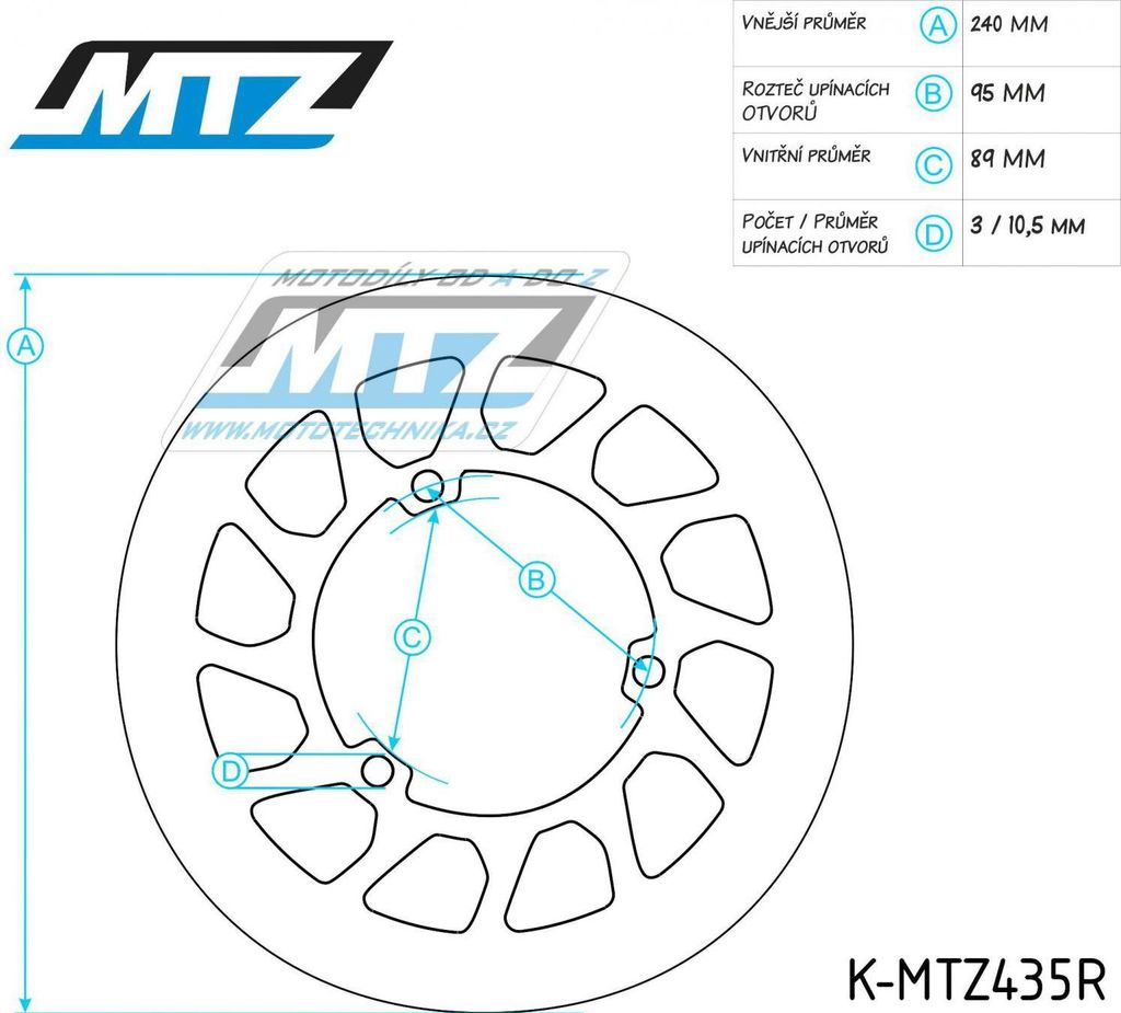 Brzdové kotouče MTZ jsou vyrobeny ze speciální ušlechtilé nerezové oceli s excelentní kombinací vlastností (vysoká pevnost, odolnost proti teplotě, dlouhá životnost, nízká hmotnost) a jsou vyráběny pomocí moderních výrobních a technologických postupů.    Robustní konstrukce s dostatečným odlehčením rovnoměrně využívá   celou plochu   brzdových destiček   a   eliminuje deformaci vlivem   zahřát i při brzdění. Zajíždění: Nový brzdový kotouč (s novými brzdovými destičkami) je nutno správným způsobem zajet, aby byla zaručena dlouhá životnost a správný brzdný účinek (je potřeba min. 80% kontaktní plocha mezi destičkami a kotoučem). Během zajíždění je důležité se vyvarovat vysokým rychlostem, které vyžadují silné a prudké brzdění. Brzdový kotouč je nutno vyměnit, jakmile tloušťka kotouče klesne pod doporučený parametr (MIN.TH.) - viz. manuál výrobce motocyklu. Při výměně brzdového kotouče je doporučeno provést vždy výměnu brzdových destiček!