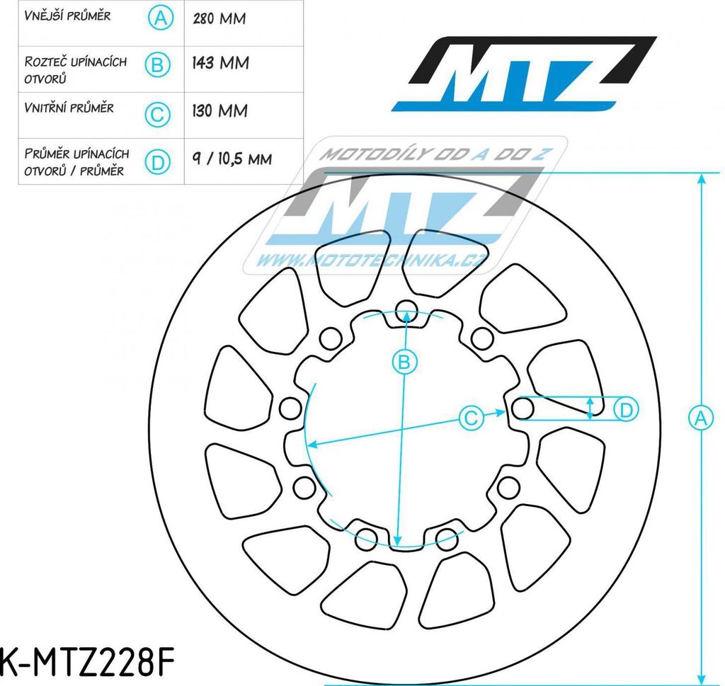 Brzdové kotouče MTZ jsou vyrobeny ze speciální ušlechtilé nerezové oceli s excelentní kombinací vlastností (vysoká pevnost, odolnost proti teplotě, dlouhá životnost, nízká hmotnost) a jsou vyráběny pomocí moderních výrobních a technologických postupů. Robustní konstrukce s dostatečným odlehčením rovnoměrně využívá celou plochu brzdových destiček a eliminuje deformaci vlivem zahřát i při brzdění. Zajíždění: Nový brzdový kotouč (s novými brzdovými destičkami) je nutno správným způsobem zajet, aby byla zaručena dlouhá životnost a správný brzdný účinek (je potřeba min. 80% kontaktní plocha mezi destičkami a kotoučem). Během zajíždění je důležité se vyvarovat vysokým rychlostem, které vyžadují silné a prudké brzdění. Brzdový kotouč je nutno vyměnit, jakmile tloušťka kotouče klesne pod doporučený parametr (MIN.TH.) - viz. manuál výrobce motocyklu. Při výměně brzdového kotouče je doporučeno provést vždy výměnu brzdových destiček!