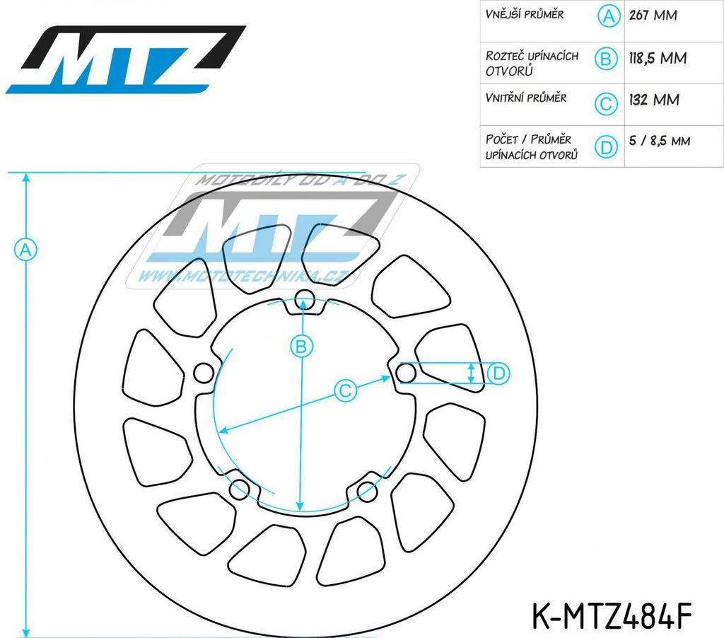 Brzdové kotouče MTZ jsou vyrobeny ze speciální ušlechtilé nerezové oceli s excelentní kombinací vlastností (vysoká pevnost, odolnost proti teplotě, dlouhá životnost, nízká hmotnost) a jsou vyráběny pomocí moderních výrobních a technologických postupů. Robustní konstrukce s dostatečným odlehčením rovnoměrně využívá celou plochu brzdových destiček a eliminuje deformaci vlivem zahřát i při brzdění. Zajíždění: Nový brzdový kotouč (s novými brzdovými destičkami) je nutno správným způsobem zajet, aby byla zaručena dlouhá životnost a správný brzdný účinek (je potřeba min. 80% kontaktní plocha mezi destičkami a kotoučem). Během zajíždění je důležité se vyvarovat vysokým rychlostem, které vyžadují silné a prudké brzdění. Brzdový kotouč je nutno vyměnit, jakmile tloušťka kotouče klesne pod doporučený parametr (MIN.TH.) - viz. manuál výrobce motocyklu. Při výměně brzdového kotouče je doporučeno provést vždy výměnu brzdových destiček!