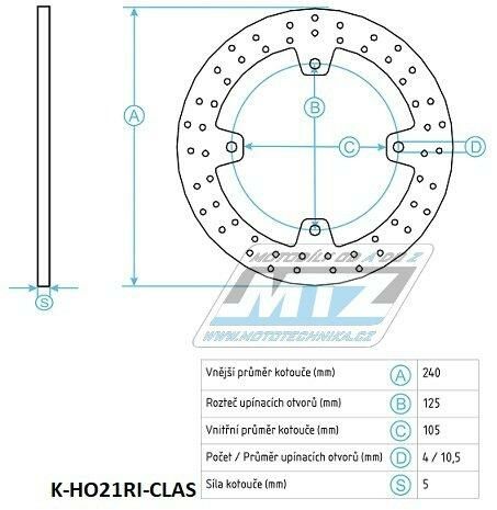 Kotouč brzdový (240/105,5/4D) - Honda NSS125+250+300 Forza + SH300i+FJS400+600Silver Wing+CB500+XL600V Transalp+XL650V Transalp+XRV650 AfrikaTwin+XL700V Transalp+CB750 Seven Fifty+CB900F Hornet + Cagi K-HO21RI-CLAS