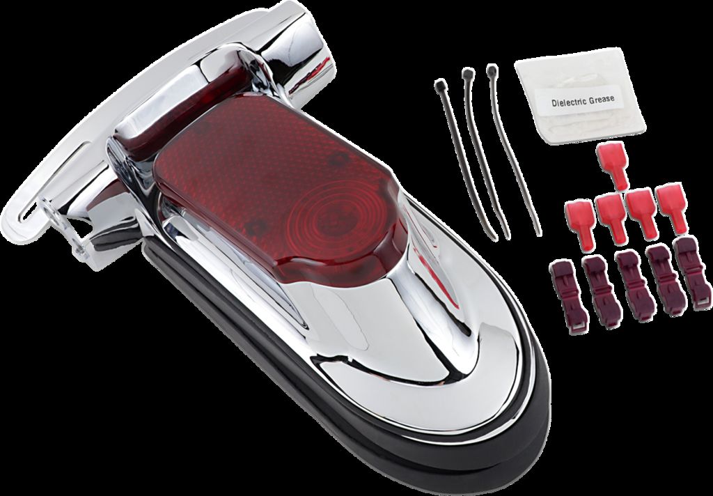 Universal Tombstone Taillight with Turn Signal Mount and License Plate BracketClassic look, modern convenience Features high-intensity červená LEDs and low-profile chrome housing that lays back against the fender Designed for custom applications; will not replace stock H-D taillight on a stock H-D blatník without extensive modifications; may require drilling for installation Includes kompletní run/brake LED taillight, chrome base plate/turn signal mount, built-in license plate light, and a removable license plate mount bracket Turn signal mounts specifically designed for Küryakyn Silver Bullets turn signals (not available from Drag Specialties) Taillight does not completely kryt all mounting holes. Not DOT compliant.