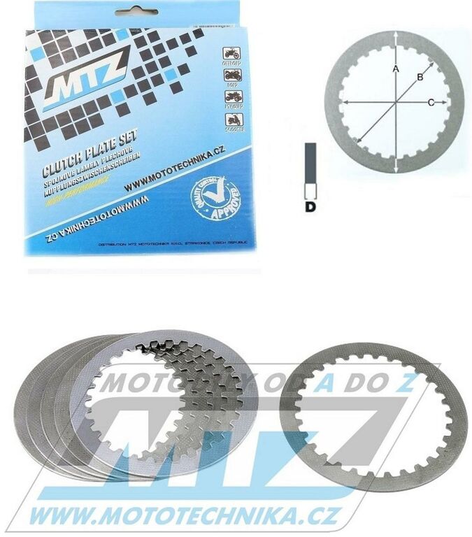 Spojkové lamely MTZ jsou ekvivalentní a plnohodnotnou náhradou za originální lamely - jsou vyrobeny přesně podle originální (OEM) specifikace a parametrů z kvalitního materiálu poskytující plnohodnotnou funkci spojky, velmi dobrou setrvačnost a přenos výkonu - poskytují dobrou užitnou hodnotu (výhodný poměr cena/výkon) - díky použitému materiálu udržují ocelové spojkové lamely (ocelové meziplechy / plechy spojky) olej v čistějším stavu po delší dobu používání a poskytující velmi dobrou odolnost a tvarovou stálost - lamely MTZ jsou určené pro hobby offroadové použití (hobby motokros, hobby enduro, čtyřkolky) Při výměně spojkových lamel je potřeba zkontrolovat i stav všech lamel a spojkových pružin, neboť výměna jen lamel či jen meziplechů nemusí odstranit problém se spojkou. Při montáži je potřeba postupovat dle manuálu výrobce motocyklu. Lamely jsou dodávány v sadě, která obsahuje přesný počet dle typu a roku výroby motocyklu. Spojkové lamely s obložením a spojkové pružiny je nutno objednat samostatně. Počet kusů v balení: 6 ks Rozměry lamel: A = 145,5 mm B = 122 mm C = 112,5 mm D = 2 mm Počet vnitřních zubů: 30 Tato sada lamel nahrazuje jednotlivé originální lamely (originální kód OEM): Kawasaki 13089-026 Vhodné pro motocykly: Kawasaki EN450 / 85-89 Kawasaki EN500 Vulcan / 90-03 Kawasaki ER-5 Twister / 97-06 Kawasaki ER500 / 97-06 Kawasaki GPZ400R / 83-88 Kawasaki GPZ550 / 82-83 Kawasaki GPZ550 Uni Trak / 84-89 Kawasaki GPZ500S / 87-04 Kawasaki GPX600R / 88-99 Kawasaki GPZ600R Ninja / 85-90 Kawasaki KLE500 / 91-07 Kawasaki KL650 Tengai / 89-92 Kawasaki KLR600 / 84-89 Kawasaki KLR650 / 87-88 Kawasaki KLX650C / 93-95 Kawasaki Z400F / 83-87 Kawasaki Z400J / 80-83 Kawasaki Z550 / 81-82 Kawasaki Z550F / 83-85 Kawasaki Z550GT / 83-90 Kawasaki ZL600 Eliminator / 86-88 Kawasaki ZL600 Eliminator / 95-97 Kawasaki ZR550 Zephyr / 83-84 Kawasaki ZR550 Zephyr / 91-96