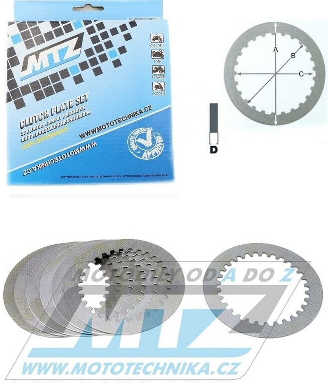 Spojkové lamely MTZ jsou ekvivalentní a plnohodnotnou náhradou za originální lamely - jsou vyrobeny přesně podle originální (OEM) specifikace a parametrů z kvalitního materiálu poskytující plnohodnotnou funkci spojky, velmi dobrou setrvačnost a přenos výkonu - poskytují dobrou užitnou hodnotu (výhodný poměr cena/výkon) - díky použitému materiálu udržují ocelové spojkové lamely (ocelové meziplechy / plechy spojky) olej v čistějším stavu po delší dobu používání a poskytující velmi dobrou odolnost a tvarovou stálost - lamely MTZ jsou určené pro hobby offroadové použití (hobby motokros, hobby enduro, čtyřkolky) Při výměně spojkových lamel je potřeba zkontrolovat i stav všech lamel a spojkových pružin, neboť výměna jen lamel či jen meziplechů nemusí odstranit problém se spojkou. Při montáži je potřeba postupovat dle manuálu výrobce motocyklu. Lamely jsou dodávány v sadě, která obsahuje přesný počet dle typu a roku výroby motocyklu. Spojkové lamely s obložením a spojkové pružiny je nutno objednat samostatně. Počet kusů v balení: 7 ks Rozměry lamel: A = 120,5 mm B = 93,5 mm C = 84,5 mm D = 1,8 mm Počet vnitřních zubů: 30 Tato sada lamel nahrazuje jednotlivé originální lamely (originální kód OEM): Kawasaki 13089-1070 Kawasaki 13089-1094 Vhodné pro motocykly: Kawasaki KX125 / 84-93 Kawasaki KDX200 / 86-88