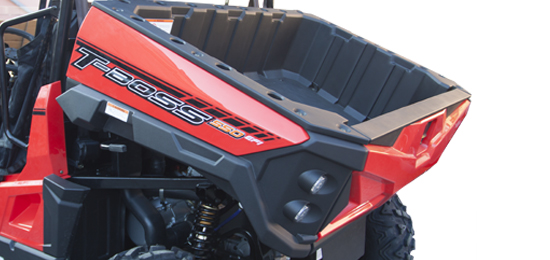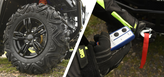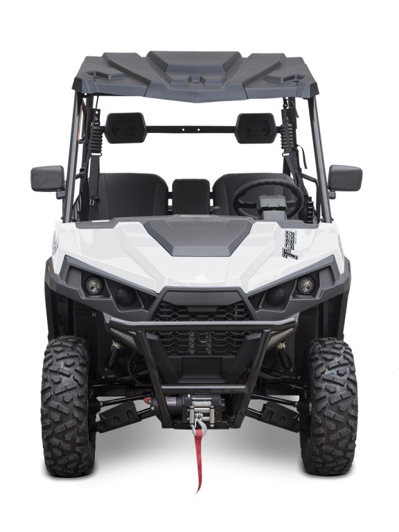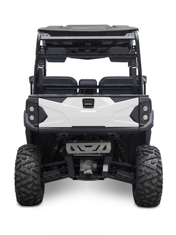 Elektrický posilovač řízení, pevná plastová střecha odolná UV záření, poloviční čelní plexi, masivní přední ochranný rám, bezpečnostní síťka na straně řidiče i spolujezdce, madla pro spolujezdce, robustní sklápěcí ocelová korba s plynovými vzpěrami, hlavové opěrky, tažné zařízení, elektrický naviják s tažnou silou 3000lbs a dálkovým ovládáním.