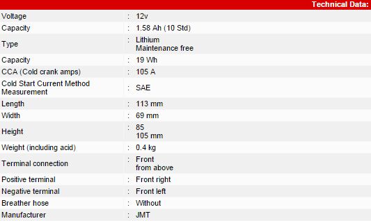 Lithium-iontové baterie od JMT, high-tech pro váš motocykl. 12V 1.58Ah, rozměry 113x69x85;105, značení dle normy JIS YTX5L-FP