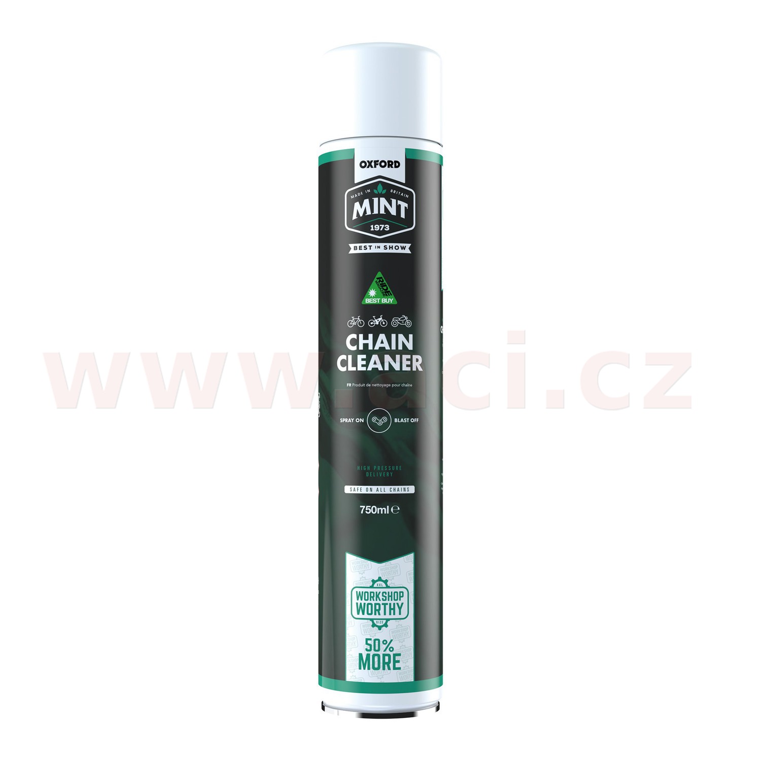 Čistič, který dokáže z povrchu řetězu odstranit a vyplavit zbytky maziva řetězu a zaschlé nečistoty obsahující prachové a kovové částice. Emulzní látka ve složení čističe dovoluje, aby bylo možné povrch řetězu kompletně opláchnout před aplikací nového maziva na řetězy. Produkt z řady položek moto/cyklo sortimentu značky MINT pro čištění. Aroma s vůní máty. Balení o objemu 750 ml pro dílenskou spotřebu.