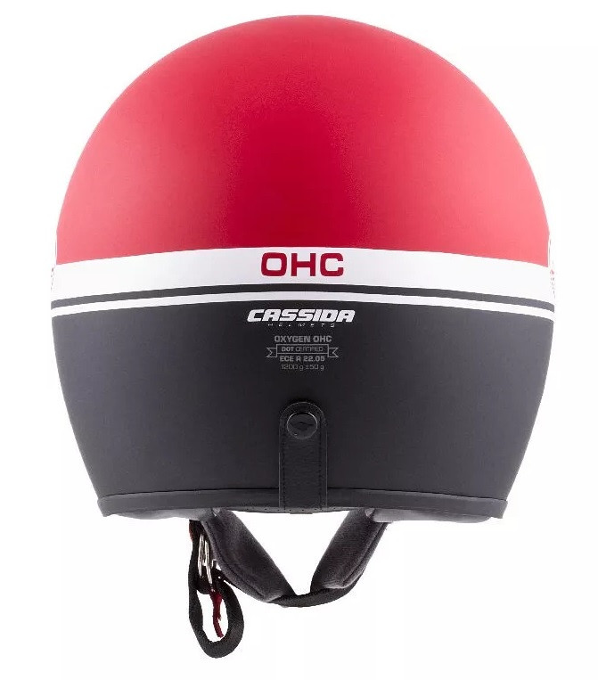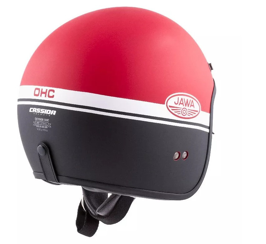 Otevřená přilba na motorku Cassida Oxygen Jawa OHC červeno-černo-bílá, má skořepinu z polykarbonátu. Grafika je z limitované edice ve spolupráci s výrobcem motocyklů JAWA. Součástí je integrovaná sluneční clona, kterou velice snadno sklopíte pomocí páčky - není potřeba cpát do helmy klasické sluneční brýle a krátký kšilt je taky součástí balení.