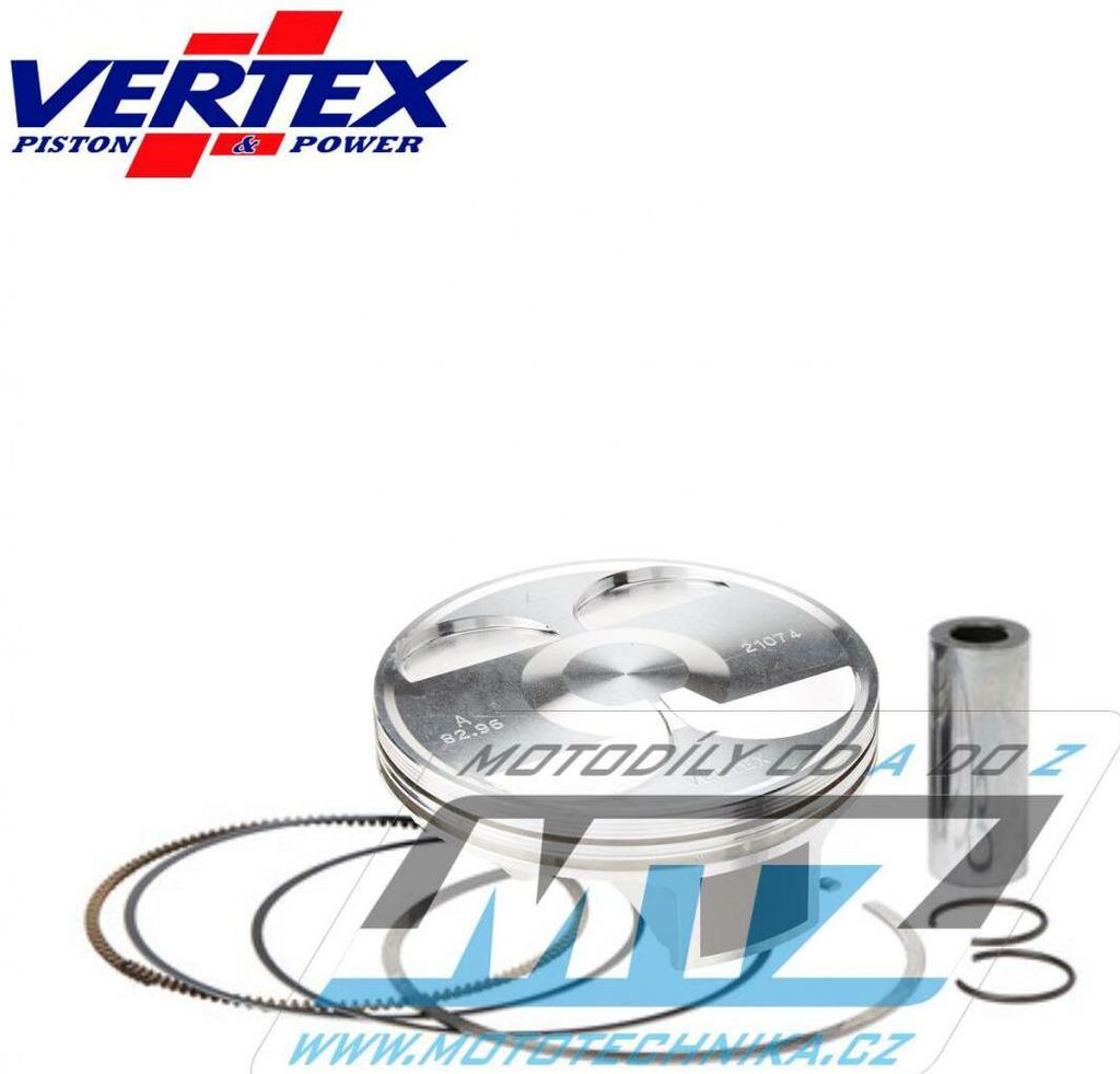 Písty Vertex jsou vysoce technicky inovativní a vysoce kvalitní písty vyráběné ze speciálního materiálu a obráběné z jednoho kusu na nejmodernějších CNC strojích v Itálii. - rozměr pístu = 82,97mm - komprese = 13.2:1 - povrchová úprava = molybden / teflon - varianta pístu = kovaný píst Vždy jsou dodávány jako pístní sada, tedy včetně pístních kroužků, čepů a pojistných kroužků té nejvyšší kvality. Tato sada nahrazuje originální díly (OEM Replacement): Honda 13101-KRN-A40 Honda 13111-KRN-A40 Honda 13111-KRN-A60 Honda 13011-KRN-A40 Honda 13112-MEE-000 Všechny písty jsou tepelně zušlechťovány T5 nebo T6 kalením a popouštěním, a jsou opatřeny speciální povrchovou úpravou Molybden-Bisulfid. 2-taktní písty jsou výhradně lité písty (nejsou kované) - vyrobené z speciální hliníkové slitiny s obsahem samomazného křemíku (obsah 18%), který zajišťuje snížení tření mezi pístem a válcem pro zvýšení životnosti pístu i při závodním použití a odlehčení pístu při zachování potřebné pevnosti. 4-taktní písty jsou výhradně kované písty se zdokonalenou pevností a životností. Písty ve variantě RACE jsou dostupné jen pro některé modely a značky motocyklů a jejich konstrukce byla zdokonalena vývojovým oddělením značky Vertex za účelem dosažení kvalitnějšího pístu, zvýšené komprese, nižší hmotnosti a vyššího výkonu. Písty ve variantě PRO jsou kované písty se speciálním hliníko-křemičiným legováním, jejich konstrukce je speciálně upravena pro závodní použití a odlehčena (extra lehké písty), jsou vybaveny chromovanými pístními kroužky a extra odlehčeným čepem s dvojitým konusem. Značka VERTEX je výrobcem komponentů motoru nejvyšší světové úrovně od roku 1953. Sortiment zahrnuje komponenty pro motocykly, motokáry, skútry, vodní skútry, lodě, sněžné skútry, zahradní techniku, užitková vozidla, kompresory. Ve výrobě jsou používány nejmodernější technologie, jakostní výrobní normy a systémy řízení výrobních procesů. Od roku 1996 je Vertex dodavatelem do prvovýroby značky KTM! Výrobky značky Vertex jsou používány v prvovýrobě i dalších značek (Beta, Gas-Gas, Husqvarna, Sherco, Moto TM a další) a také závodními týmy nejvyšší světové úrovně (Kawasaki Pro Circuit, Honda HRC Racing, Yamaha Factory, Beta Factory, Moto3).