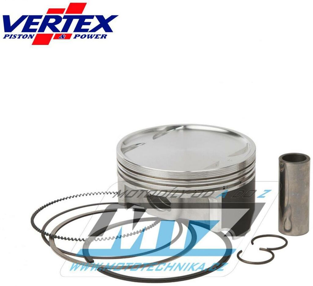 Písty Vertex jsou vysoce technicky inovativní a vysoce kvalitní písty vyráběné ze speciálního materiálu a obráběné z jednoho kusu na nejmodernějších CNC strojích v Itálii. - rozměr pístu = 90,96mm (Big Bore) - komprese = 9.0:1 - povrchová úprava = molybden / teflon - varianta pístu = kovaný píst Vždy jsou dodávány jako pístní sada, tedy včetně pístních kroužků, čepů a pojistných kroužků té nejvyšší kvality. Tento píst nahrazuje originální díl (OEM Replacement): Kawasaki 13001-0021 Kawasaki 13008-0008 Kawasaki 13008-0040 Kawasaki 13002-1060 Kawasaki 92033-1207 Všechny písty jsou tepelně zušlechťovány T5 nebo T6 kalením a popouštěním, a jsou opatřeny speciální povrchovou úpravou Molybden-Bisulfid. 2-taktní písty jsou výhradně lité písty (nejsou kované) - vyrobené z speciální hliníkové slitiny s obsahem samomazného křemíku (obsah 18%), který zajišťuje snížení tření mezi pístem a válcem pro zvýšení životnosti pístu i při závodním použití a odlehčení pístu při zachování potřebné pevnosti. 4-taktní písty jsou výhradně kované písty se zdokonalenou pevností a životností. Písty ve variantě RACE jsou dostupné jen pro některé modely a značky motocyklů a jejich konstrukce byla zdokonalena vývojovým oddělením značky Vertex za účelem dosažení kvalitnějšího pístu, zvýšené komprese, nižší hmotnosti a vyššího výkonu. Písty ve variantě PRO jsou kované písty se speciálním hliníko-křemičiným legováním, jejich konstrukce je speciálně upravena pro závodní použití a odlehčena (extra lehké písty), jsou vybaveny chromovanými pístními kroužky a extra odlehčeným čepem s dvojitým konusem. Značka VERTEX je výrobcem komponentů motoru nejvyšší světové úrovně od roku 1953. Sortiment zahrnuje komponenty pro motocykly, motokáry, skútry, vodní skútry, lodě, sněžné skútry, zahradní techniku, užitková vozidla, kompresory. Ve výrobě jsou používány nejmodernější technologie, jakostní výrobní normy a systémy řízení výrobních procesů. Od roku 1996 je Vertex dodavatelem do prvovýroby značky KTM! Výrobky značky Vertex jsou používány v prvovýrobě i dalších značek (Beta, Gas-Gas, Husqvarna, Sherco, Moto TM a další) a také závodními týmy nejvyšší světové úrovně (Kawasaki Pro Circuit, Honda HRC Racing, Yamaha Factory, Beta Factory, Moto3).