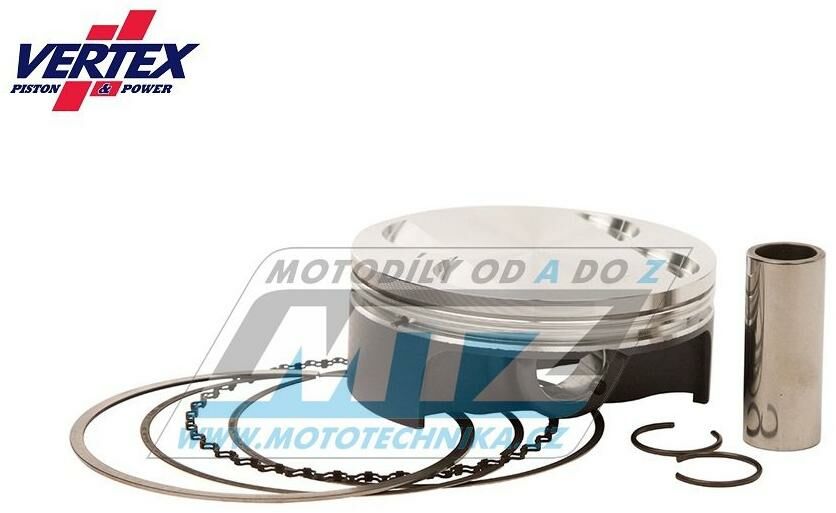 Písty Vertex jsou vysoce technicky inovativní a vysoce kvalitní písty vyráběné ze speciálního materiálu a obráběné z jednoho kusu na nejmodernějších CNC strojích v Itálii. - rozměr pístu = 96,96mm (Big Bore) - komprese = 11:1 - povrchová úprava = molybden / teflon - varianta pístu = kovaný píst Vždy jsou dodávány jako pístní sada, tedy včetně pístních kroužků, čepů a pojistných kroužků té nejvyšší kvality. Tento píst nahrazuje originální díl (OEM Replacement): KTM 59030007000 KTM 59030033000 KTM 58030631000 KTM 59030032000 KTM 59030074000 Beta 3625417000 Beta 3625225000 Beta 3625179000 Beta 3625224000 Beta 3625233000 Polaris 2203407 Polaris 2203408 Polaris 3021872 Polaris 3021873 Polaris 3021874 Polaris 3021875 Všechny písty jsou tepelně zušlechťovány T5 nebo T6 kalením a popouštěním, a jsou opatřeny speciální povrchovou úpravou Molybden-Bisulfid. 2-taktní písty jsou výhradně lité písty (nejsou kované) - vyrobené z speciální hliníkové slitiny s obsahem samomazného křemíku (obsah 18%), který zajišťuje snížení tření mezi pístem a válcem pro zvýšení životnosti pístu i při závodním použití a odlehčení pístu při zachování potřebné pevnosti. 4-taktní písty jsou výhradně kované písty se zdokonalenou pevností a životností. Písty ve variantě RACE jsou dostupné jen pro některé modely a značky motocyklů a jejich konstrukce byla zdokonalena vývojovým oddělením značky Vertex za účelem dosažení kvalitnějšího pístu, zvýšené komprese, nižší hmotnosti a vyššího výkonu. Písty ve variantě PRO jsou kované písty se speciálním hliníko-křemičiným legováním, jejich konstrukce je speciálně upravena pro závodní použití a odlehčena (extra lehké písty), jsou vybaveny chromovanými pístními kroužky a extra odlehčeným čepem s dvojitým konusem. Značka VERTEX je výrobcem komponentů motoru nejvyšší světové úrovně od roku 1953. Sortiment zahrnuje komponenty pro motocykly, motokáry, skútry, vodní skútry, lodě, sněžné skútry, zahradní techniku, užitková vozidla, kompresory. Ve výrobě jsou používány nejmodernější technologie, jakostní výrobní normy a systémy řízení výrobních procesů. Od roku 1996 je Vertex dodavatelem do prvovýroby značky KTM! Výrobky značky Vertex jsou používány v prvovýrobě i dalších značek (Beta, Gas-Gas, Husqvarna, Sherco, Moto TM a další) a také závodními týmy nejvyšší světové úrovně (Kawasaki Pro Circuit, Honda HRC Racing, Yamaha Factory, Beta Factory, Moto3).