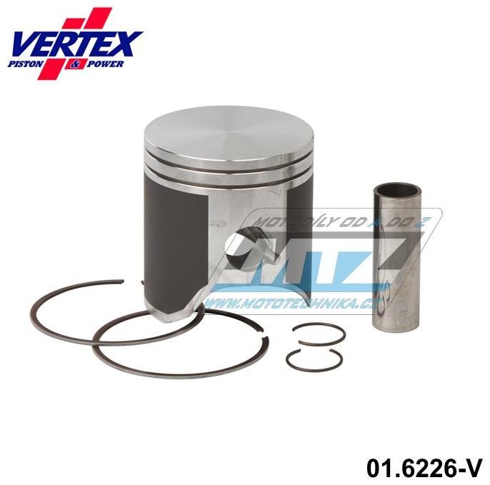 Písty Vertex jsou vysoce technicky inovativní a vysoce kvalitní písty vyráběné ze speciálního materiálu a obráběné z jednoho kusu na nejmodernějších CNC strojích v Itálii. rozměr pístu = 57,94/57,95/57,96mm komprese = standard (Replica) povrchová úprava = molybden / teflon varianta pístu = litý píst Vždy jsou dodávány jako pístní sada, tedy včetně pístních kroužků, čepů a pojistných kroužků té nejvyšší kvality. Všechny písty jsou tepelně zušlechťovány T5 nebo T6 kalením a popouštěním, a jsou opatřeny speciální povrchovou úpravou Molybden-Bisulfid. 2-taktní písty jsou výhradně lité písty (nejsou kované) - vyrobené z speciální hliníkové slitiny s obsahem samomazného křemíku (obsah 18%), který zajišťuje snížení tření mezi pístem a válcem pro zvýšení životnosti pístu i při závodním použití a odlehčení pístu při zachování potřebné pevnosti. 4-taktní písty jsou výhradně kované písty se zdokonalenou pevností a životností. Všechny písty (2tatkní i 4taktní) jsou tepelně zušlechťovány T5 nebo T6 kalením a popouštěním, a jsou opatřeny speciální povrchovou úpravou Molybden-Bisulfid. Písty ve variantě RACE jsou dostupné jen pro některé modely a značky motocyklů a jejich konstrukce byla zdokonalena vývojovým oddělením značky Vertex za účelem dosažení kvalitnějšího pístu, zvýšené komprese, nižší hmotnosti a vyššího výkonu. Písty ve variantě PRO jsou kované písty se speciálním hliníko-křemičiným legováním, jejich konstrukce je speciálně upravena pro závodní použití a odhlečena (extra lehké písty), jsou vybaveny chromovanými pistními kroužky a extra odlehčeným čepem s dvojitým konusem.