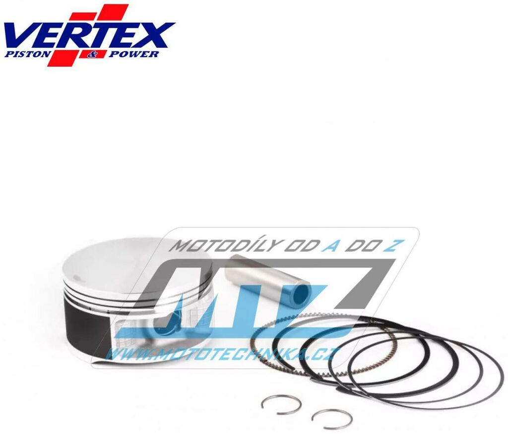 Písty Vertex jsou vysoce technicky inovativní a vysoce kvalitní písty vyráběné ze speciálního materiálu a obráběné z jednoho kusu na nejmodernějších CNC strojích v Itálii. - rozměr pístu = 73,96mm - komprese = Race HC-zvýšená komprese - povrchová úprava = molybden / teflon - varianta pístu = kovaný píst Vždy jsou dodávány jako pístní sada, tedy včetně pístních kroužků, čepů a pojistných kroužků té nejvyšší kvality. Tato sada nahrazuje originální díly (OEM Replacement): Kymco Všechny písty jsou tepelně zušlechťovány T5 nebo T6 kalením a popouštěním, a jsou opatřeny speciální povrchovou úpravou Molybden-Bisulfid. 2-taktní písty jsou výhradně lité písty (nejsou kované) - vyrobené z speciální hliníkové slitiny s obsahem samomazného křemíku (obsah 18%), který zajišťuje snížení tření mezi pístem a válcem pro zvýšení životnosti pístu i při závodním použití a odlehčení pístu při zachování potřebné pevnosti. 4-taktní písty jsou výhradně kované písty se zdokonalenou pevností a životností. Písty ve variantě RACE jsou dostupné jen pro některé modely a značky motocyklů a jejich konstrukce byla zdokonalena vývojovým oddělením značky Vertex za účelem dosažení kvalitnějšího pístu, zvýšené komprese, nižší hmotnosti a vyššího výkonu. Písty ve variantě PRO jsou kované písty se speciálním hliníko-křemičiným legováním, jejich konstrukce je speciálně upravena pro závodní použití a odlehčena (extra lehké písty), jsou vybaveny chromovanými pístními kroužky a extra odlehčeným čepem s dvojitým konusem. Značka VERTEX je výrobcem komponentů motoru nejvyšší světové úrovně od roku 1953. Sortiment zahrnuje komponenty pro motocykly, motokáry, skútry, vodní skútry, lodě, sněžné skútry, zahradní techniku, užitková vozidla, kompresory. Ve výrobě jsou používány nejmodernější technologie, jakostní výrobní normy a systémy řízení výrobních procesů. Od roku 1996 je Vertex dodavatelem do prvovýroby značky KTM! Výrobky značky Vertex jsou používány v prvovýrobě i dalších značek (Beta, Gas-Gas, Husqvarna, Sherco, Moto TM a další) a také závodními týmy nejvyšší světové úrovně (Kawasaki Pro Circuit, Honda HRC Racing, Yamaha Factory, Beta Factory, Moto3).
