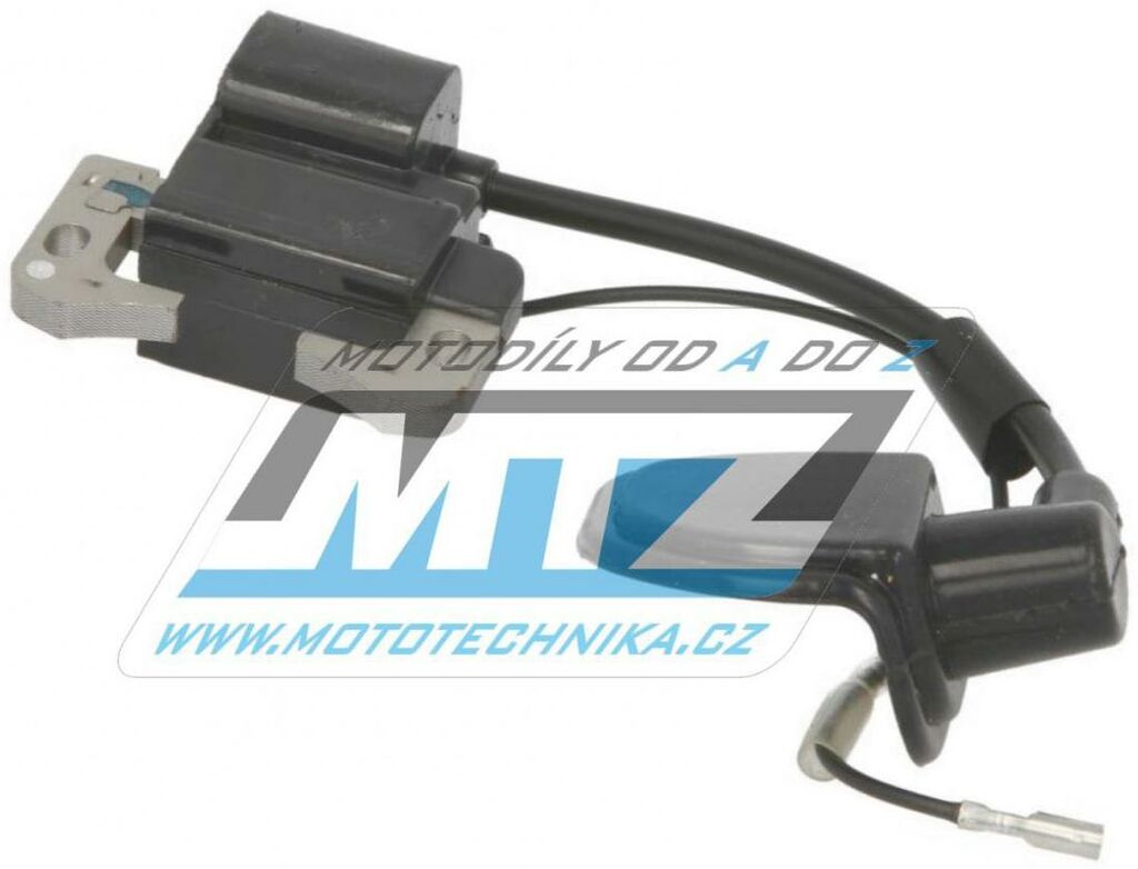 Stator zapalování s VN cívkou a kabelem ke svíčce pro čínské čtyřkolky a skútry Při magnetoelektrickém zapalování se energie pro jiskru získává z otáčivého pohybu magnetu, proto nepotřebuje baterii (Magneto). Setrvačník s permanentními magnety (rotor) je přímo spojen s klikovým hřídelem, se kterým se otáčí. Na bloku motoru je připevněn stator s cívkami. Pohyb magnetů v blízkosti jádra cívky na nich indukuje napětí. Toto napětí způsobuje, že primárním vinutím protéká proud I. Tento proud způsobí, že v primárním vinutí se akumuluje elektromagnetická energie. Po přerušení proudu kontaktem vačky (snímače otáček) se v primární cívce magnetická energie rychle ztrácí a v sekundární cívce se indukuje vysoké napětí. - pro napájení dalších spotřebičů (např. žárovky) jsou na statoru umístěny další cívky určené pouze pro tyto spotřebiče. - vhodné pro skútry, motocykly a čtyřkolky (kontrola možnosti připojení a použití viz. fotografie) - 12V - stator cívka + VN cívka - 1 vodič pro chcípák